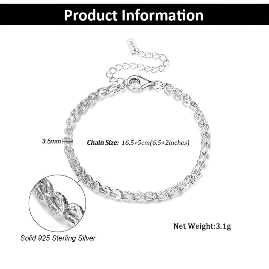 Pure 925 Silver Sleek Chip Chain Bracelet, Adjustable Length 16+5cms